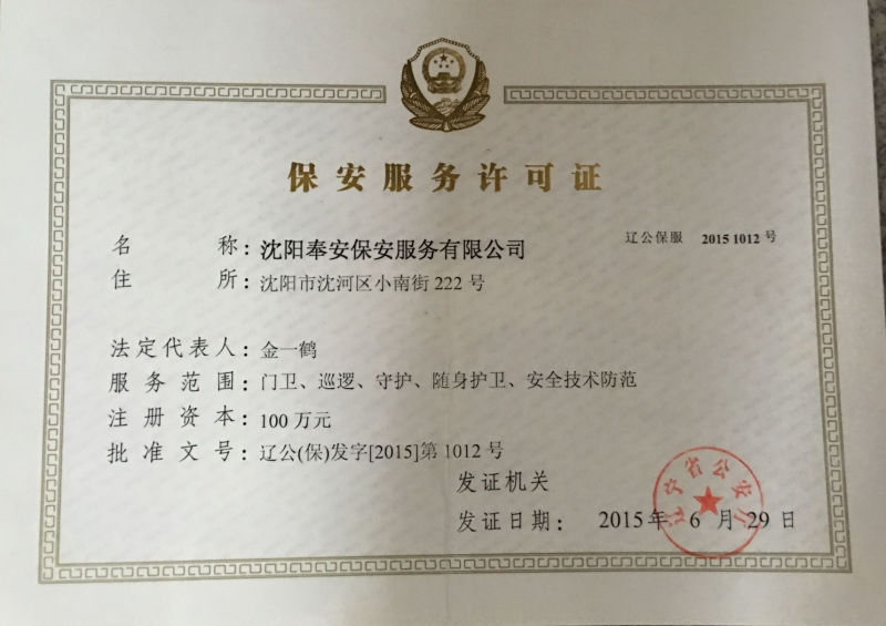 沈陽奉安保安服務(wù)有限公司(原沈陽市沈河區(qū)保安服務(wù)公司)創(chuàng)建于一九八八年八月,是遼寧省公安廳、沈陽市公安局批準(zhǔn),工商行政部門登記注冊,全市首家具備保安資質(zhì)的特殊性服務(wù)企業(yè),隸屬于沈陽市沈河區(qū)政府直管的全民國有企業(yè),現(xiàn)為中國保安協(xié)會會員單位和省保協(xié)、市保協(xié)常務(wù)理事單位:在全市同行業(yè)中率先通過ISO國際質(zhì)量認(rèn)證,是市工商局批準(zhǔn)的“重合同守信用”免檢單位和沈陽市政府采購中心保安服務(wù)項目重點競標(biāo)單位;擁有一支專業(yè)化、標(biāo)準(zhǔn)化、職業(yè)化的高素質(zhì)保安隊伍,是公安機(jī)關(guān)重要的輔警力量。